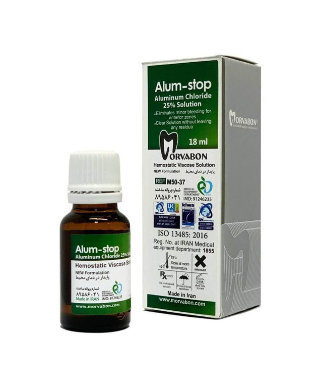 هموستات مروابن | Alum stopمحلول هموستات مروابن Alum stop به صورت محلول شفاف و بی رنگ، حاوی آلومینیوم کلراید ۲۵% می باشد. آلومینیوم کلراید برای جلوگیری از خونریزی لثه در ترمیم های کلاس ll و V و نیز قالبگیری و چسباندن رستورشین های سرامیکی بسیار کاربرد دارد. محلول انعقاد خون مروابن یک شیشه محتوی ۱۸ میل است .